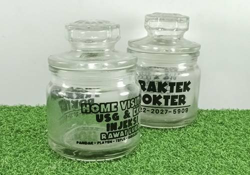 SKU: PB_001Toples Bumbung Kecil yang dibuat dari kaca ini dilengkaoi dengan tutup dan dapat diberi tambahan sablon 1 warna sesuai permintaan anda